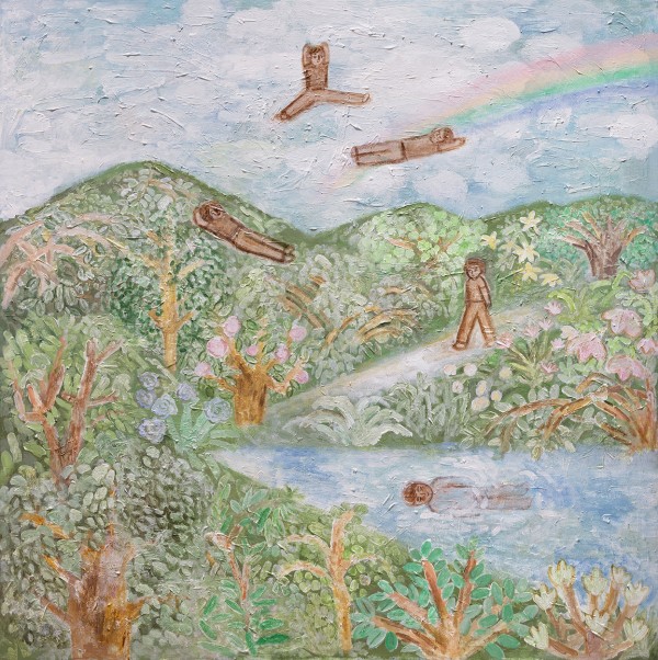 전시는 짙은 녹색과 옅은 녹색, 두 가지 주요 컬러 테마로 구성되었습니다. 짙은 녹색의 작품들은 아주 깊은 숲속, 나만이 아는 비밀스럽고 사적인 장소를 그려냅니다. 무성하게 우거진 나뭇잎 사이로 드문드문 보이는 하늘, 그 아래 편안히 휴식을 취하는 인물들. 한편, 옅은 녹색의 작품들은 한층 자유롭고 밝은 이상향의 세계를 담고 있습니다. 무지개와 가벼운 구름, 햇살이 공존하는 하늘, 어린아이처럼 헤엄치고 뛰어노는 사람들 사이에는 환희가 넘실거립니다. 몽환적이면서도 아련한 색채, 화폭 속의 디테일들과 서사는 누구나 기억 깊은 곳에 품고 있는 행복의 순간을 건드립니다. 동시에 아직 도달하지 못한 이상향을 향한 어렴풋한 동경 역시 떠올리게 됩니다.