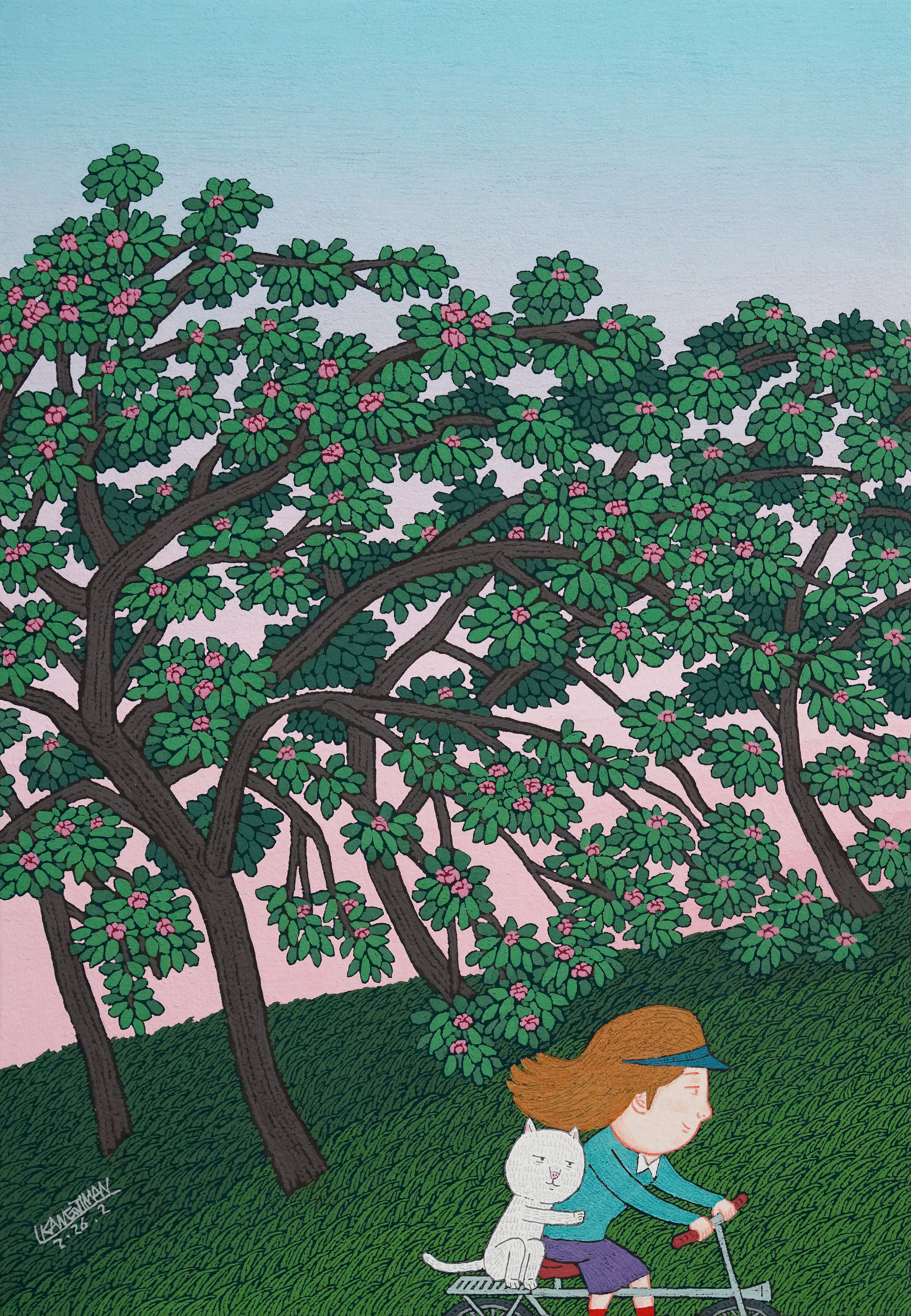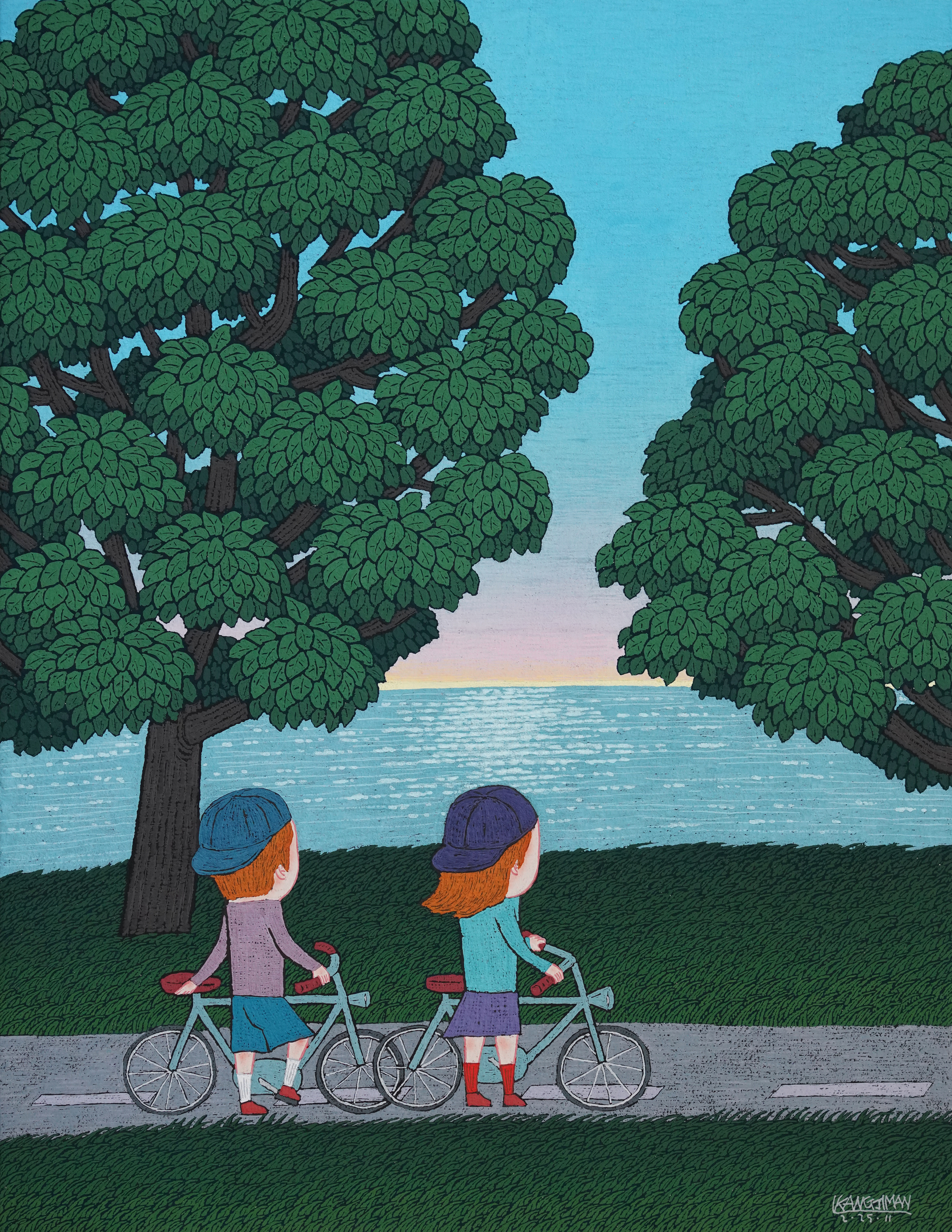강지만의 그림은 시골 생활에서 겪는 여러 상황들, 그리고 그곳에서 관찰한 것들에 자신의 환상, 꿈 등을 슬쩍 포개어 놓았다. 그것은 지극히 평범한 일상의 동선에서 잡힌 풍경이자 그 안에 작가가 부풀려낸 환상이거나 소박한 소망이의 이미지다. 전원에서 보내는 한적하고 호젓한 생활의 편린이 감촉되는 그림은 정겹고 따뜻하다. 마당을 바라보며 차를 마시는, 여유 있는 오후의 시간이거나 논둑길을 강아지, 고양이와 함께 거니는 장면 혹은 어두운 시골길에 손전등에 의지해 개와 함께 산책을 하는가 하면 해바라기가 가득 핀 마당에서 강아지를 목욕시키는 장면, 적막한 한 낮의 시간에 할머니와 스치며 지나치는 풍경, 부인과 함께 자신이 기르는 개, 고양이들을 태우고 운전을 해 어디론가 여행을 가거나 거친 바람을 맞으며 스쿠터를 타고 질주하는 모습 등이 그가 보여주는 그림들이다. 마치 일러스트레이션이나 만화, 혹은 삽화처럼 그려진 이 그림은 작가만의 독특한 캐릭터, 유머, 이야기 등을 풍성하게 드리우고 있다. 무엇보다도 얼굴을 몸에 비해 과도하게 크게 설정해 그리고 그 안에 풍부하고 재미있는 표정을 얹혀놓았으며 상대적으로 작은 손과 발이 보여주는 특별한 동작 등이 그림 보는 즐거움을 선사한다. 실세계의 예민한 관찰로부터 파생된 이미지들은 작가의 심성 속에서 필터링 돼 새로운 주인공의 형상을 빌어 다시 출현하고 재구성된다. 지난 과거의 시간을 호출하고 그 이미지를 각색해 또 다른 세계를 가설하고 있는 것이다. 이미 지난 시간의 상황들이 다시 재구성되고 고정된 이미지를 통해 영원히 봉인된 것이기도 하다. 그러자 사라진 순간의 추억, 기억이 매력적인 이미지로 응고되었다. 우리 모두는 특정한 시공간 속에서 일어나는 알 수 없는, 우발적인 사건 속에서 삶을 지속하고 그것을 운명으로 받아들이며 산다. 그 하루하루가 생의 지도를 그린다. 작가는 자신의 하루, 일상의 어느 한 장면을 대상으로 해 그것을 모종의 감성적인 ‘씬’으로 제작해서 마치 영화의 한 장면인양 보여준다. 자기 삶에서 본 것들을 채집/수집하고 그것을 기억, 분류한 후 그것을 이상적인 하나의 장면으로 구성한다. 결국 작가의 그림은 자기 몸 밖의 사태/사건에 대한 끊임없는 반응과 감응의 이미지화에 해당한다고도 볼 수도 있다.
